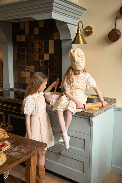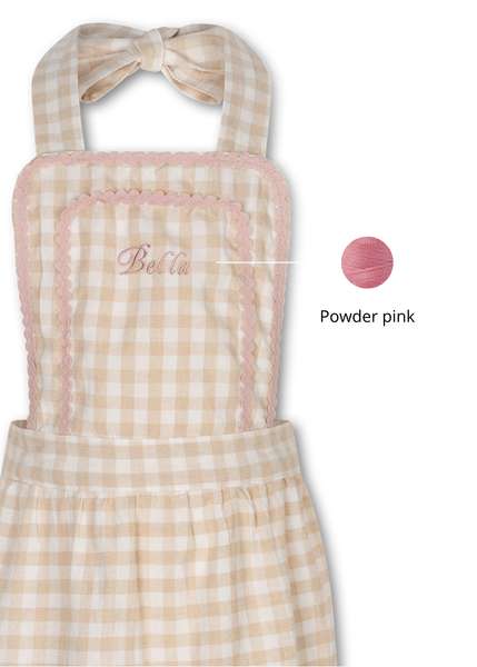 Stijlvolle checker apron voor kids, gemaakt van 100% katoen – zacht, ademend en comfortabel voor elke dag. De tijdloze beige ruitprint met subtiele roze details geeft een speelse en charmante uitstraling. De gesmokte bovenzijde zorgt voor een fijne pasvorm, terwijl de losvallende onderkant volop bewegingsvrijheid biedt. Het haltermodel met striksluiting is eenvoudig verstelbaar.
