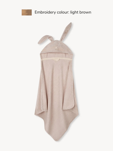 • A lovely smelling clean baby wrapped in this adorable personalised bath cape: What more can you ask for? Wrap your baby up nicely after bathing to keep him or her comfortably warm. The cape is made of the softest cotton, which absorbs well. By using the hood - with these cute bunny ears - your baby's head will also stay warm. Make the bath cape even more original by adding your child's name to the ears of the hood. This is done with the finest embroidery threads in our own workshop. Have you, like us, fallen in love with this Bath Cape Rabbit? Then make the set complete with our Le Olive Baby washcloths and bath towels.