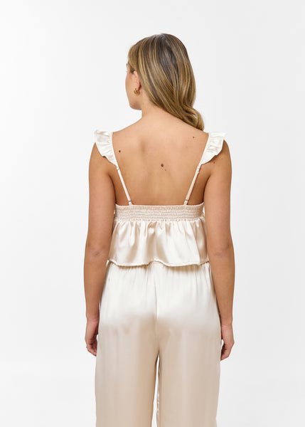 • Beauty alert! Onze pyjama set is een echte eyecatcher door de satijnachtige stof, elegante ruffles en prachtige kanten details die ‘m extra bijzonder maken. De set bestaat uit een top en bijpassende broek, samen de ultieme co-ord voor heerlijke cozy nights. Perfect om stylish in weg te dromen, we love it!