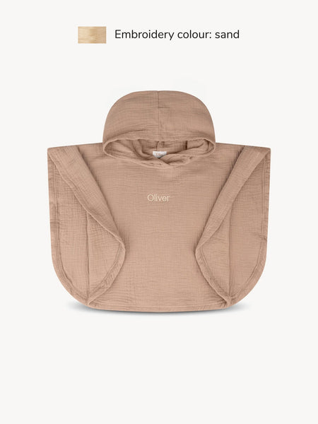 • Op het strand, na zwemles of gewoon 's avonds na een heerlijk warm badje: de hydrofiele poncho is your essential! De poncho is gemaakt van dubbellaags, zacht katoen, wat goed absorbeert en je kleintje heerlijk warm houdt. Personaliseer de poncho met de naam van jouw mini-me. Dit wordt met liefde gedaan in ons eigen atelier, met de mooiste borduurgarens. De hydrofiele poncho is verkrijgbaar in verschillende kleuren en maten.